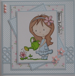 My card today is made with a Digi Garden image which I have just discovered and think they are fab. I have coloured her with my promarkers and teamed her up with some papers from the Dovecraft back to basics pad and also from a freebie pad ( I do seem to use freebie pads alot -must invest in some new papers I think!!!) I added a blue ribbon and bow and some gems.