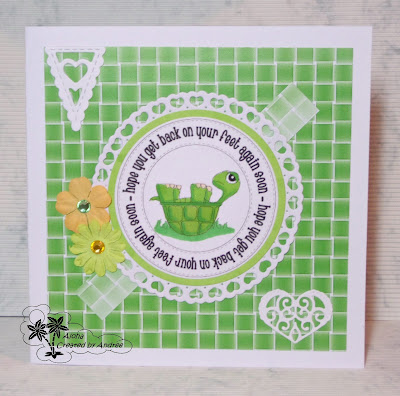 For my card I used a lovely paper from Lozzy's Checkout set as I thought the shade went so well with the little tortoise I'd coloured up with my Promarkers, which was a freebie from Birds Cards. I die cut a little banner using a die set I recently bought on ebay and the circle die was also a recent purchase too and the heart die was a freebie from a magazine.